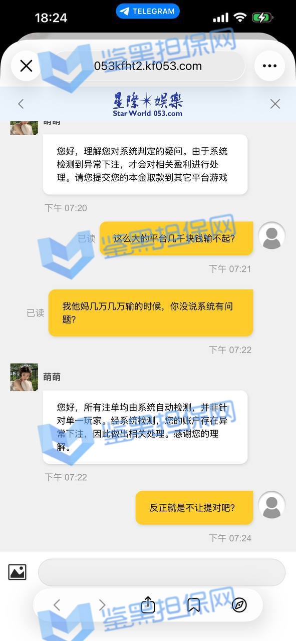 2、鉴黑担保网维权专员联系该平台相关负责人,对方表示该会员游戏时存在套利刷水行为,平台不欢迎此类套利行为玩家,做出的处理是扣除盈利退本金。维权专员让其提供相关异常投注注单进行复核,对方拒绝提供,多次表示本金已退回,该会员需更换其他地方游戏。