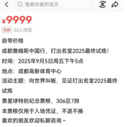 这种质疑不是空穴来风。有媒体报道,在闲鱼等第三方平台上,詹姆斯中国行活动门票最高已被炒至9999元。此外还有大量售价1000元以上的门票。
